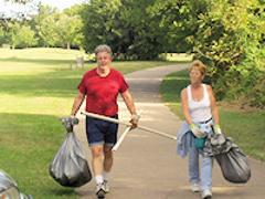 1. We suggest that you wear gloves, long sleeve shirts and long pants to protect you from thorny bushes and/or broken glass along the trails. 2. Take a wagon or cart to haul the filled trash bags out to the closest trash can. 3. Please do not leave the filled bags along the trails. 4. If you want to recycle bottles and cans you pick up you'll have to separate them and take them to your home or local recycling bin. The local authorities and waste pickup companies do not accomodate recycling along the trails. Unless you see a recycling container do not assume it will be recycled. 5. Be careful and if you see something too big or hazardous to pick up. Please advise us of the approximate location like north side of trail 1/4 mile east of the closest cross street. With that information we can get the appropriate authorities with the appropriate equipment to safely remove the items dumped along the trails. Send us an email to [email protected].