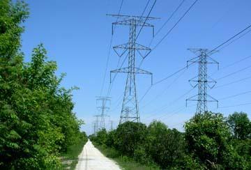 | This photo exemplifies the majority of the trail in DuPage Cty from the west, tall bushes and short trees on both sides of the trail and following the high-voltage power corridor. The surface is crushed limestone and is suitable for road bikes. An overpass carries the trail over I-355 and there is an underpass at Rte 53 but most other road crossings are unprotected and care must be taken on several of them, notably County Farm, Gary, and Schmale. As you approach the east terminus in Villa Park, you encounter more residences and industrial areas, but there are far fewer residential street crossings than found on the nearby Illinois Prairie Path which runs through the heart of several suburbs. |
